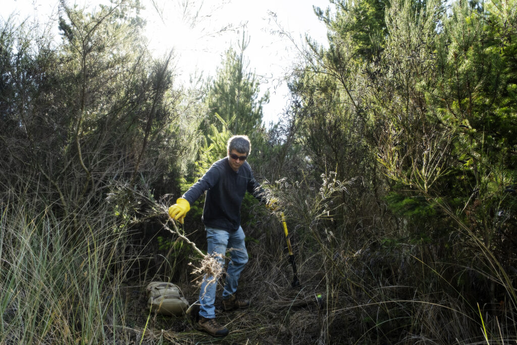 Rob Cuthrell, who lives outside of Mapleton, was one of a dozen volunteers pulling Scotch broom at the Oregon Dunes Day Area on September 27, 2025.