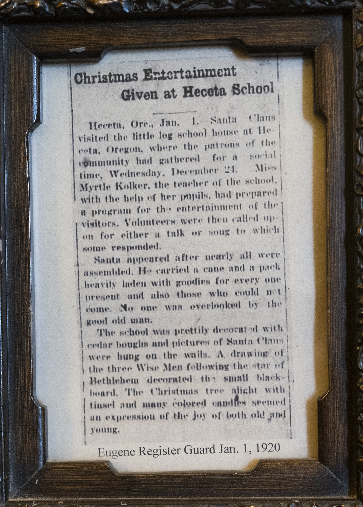 The Korgans have held the Christmas celebration every year since 1996. But a framed article from the January 1, 1920, Eugene Register-Guard sitting on the mantle of one of the fireplaces makes it clear that Santa paid a visit to Heceta long before the Korgans. The article describes a December 24, 1919, gathering at the log schoolhouse at Heceta.