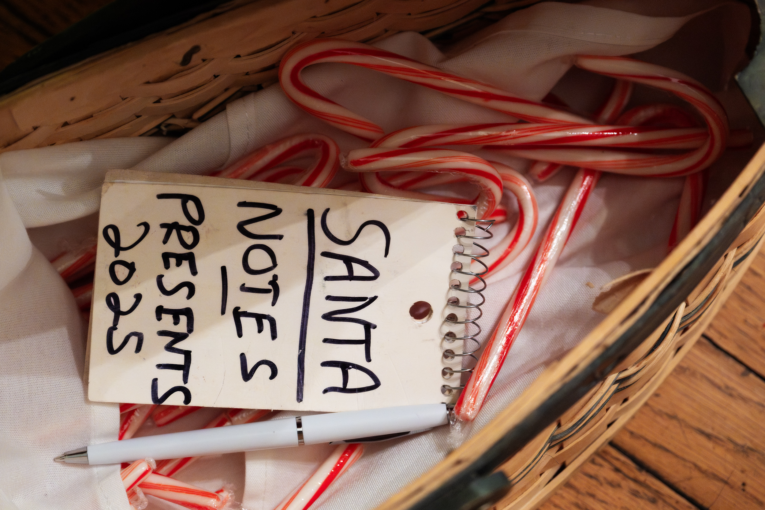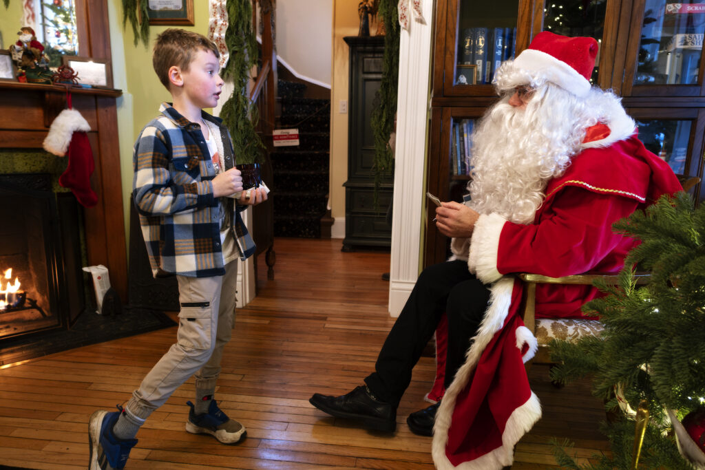 Rhoads spent most of the evening seated next to the Christmas tree in the 19th-century house that is now a bed and breakfast. A red hat, a wide black belt and a small notebook labeled “Santa Notes” completed his outfit. It was Mark Rhoads’ first time as Santa Claus. And Llewyn Newberry was the first child to talk to this first-time Santa.
