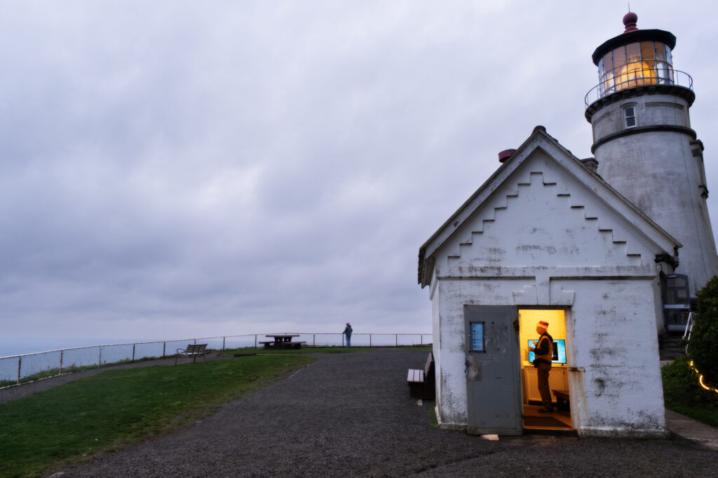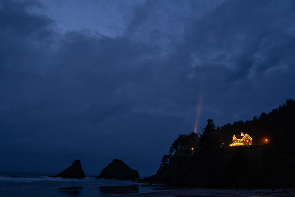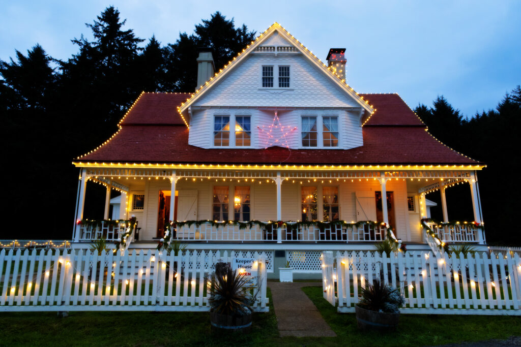 And there is the view. Waves crash on the beach below, and the ocean stretches to the horizon. At 4 p.m., the sky is bright, and the lights wrapped around the house barely glow. By 6 p.m., the house is its own beacon, visible from Route 101, and the beam of light from the lighthouse stretches across the sky, as it has for 131 years.