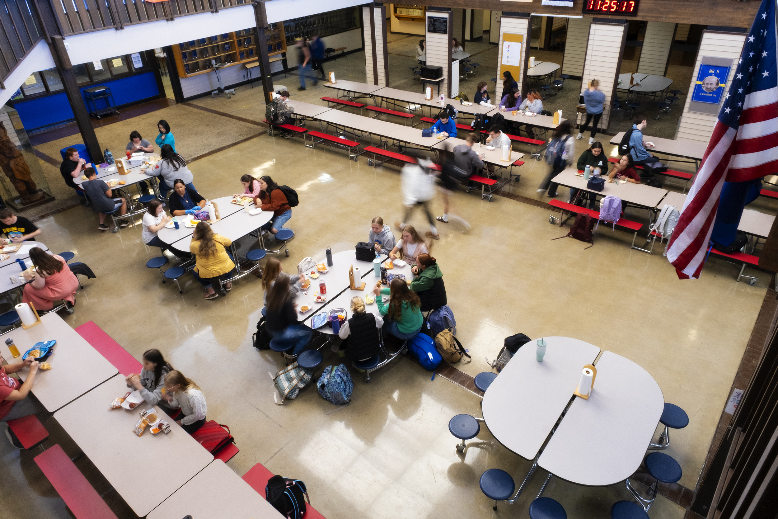 Students begin to gather for lunch in the high school in September, 2025. The space was repurposed as a cafeteria. Food is prepared in the elementary school and brought over each day. The school depends on students leaving campus for lunch, and most do, because the space is too small to accommodate everyone at the same time, Principal Harklerode said.