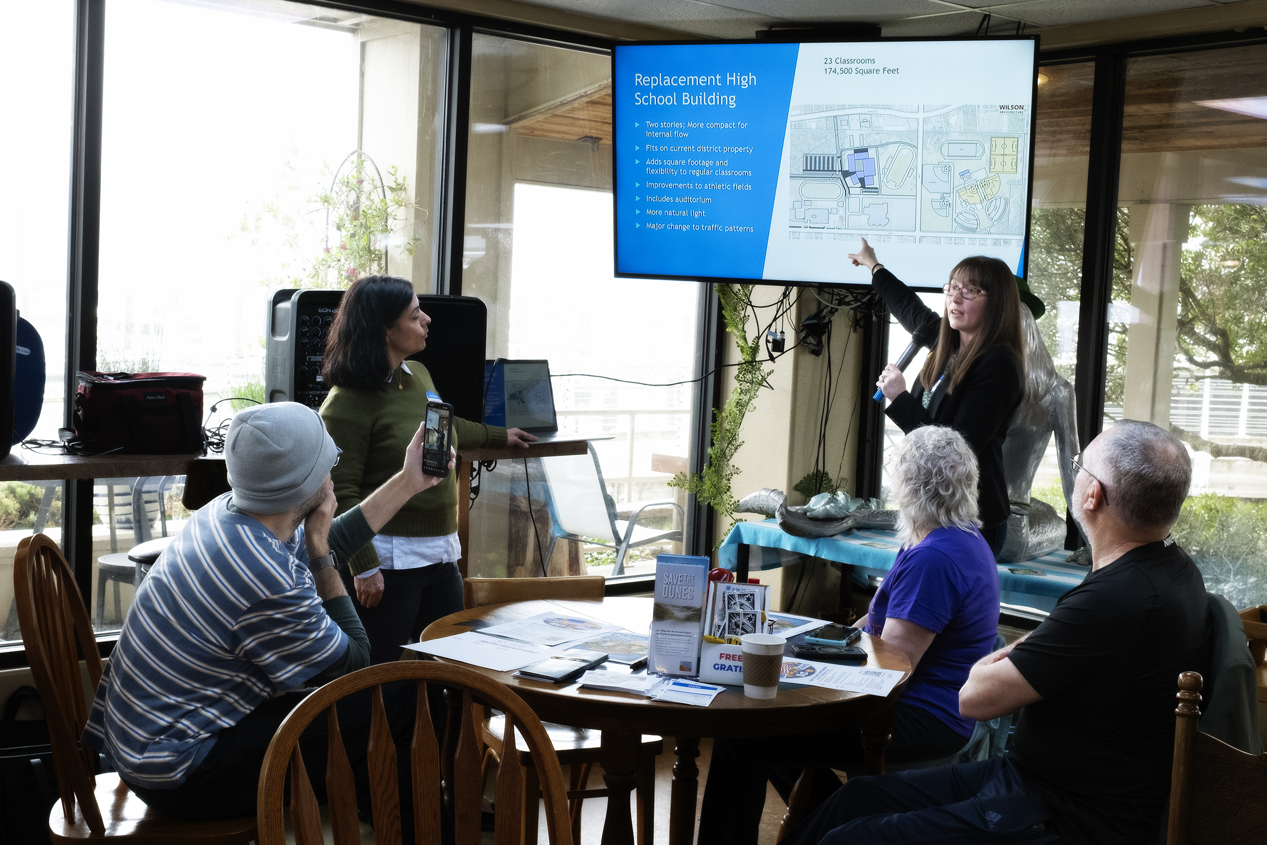 Laurel Ferguson promotes the Siuslaw School Bond at a public meeting at Bridgeport Market on March 20, 2026.