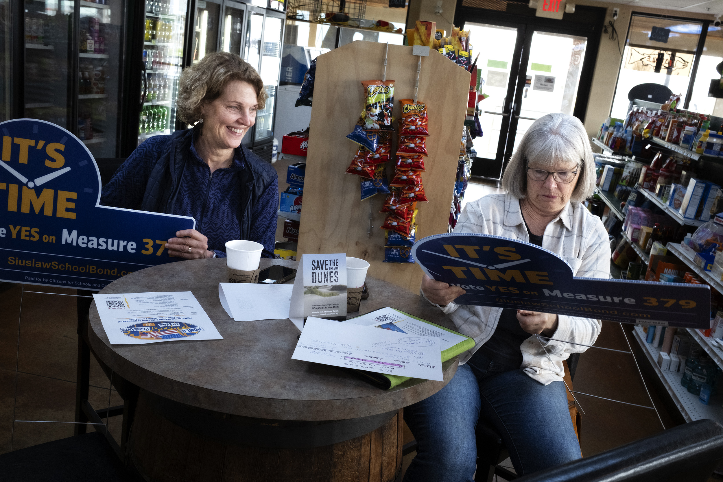 Supporters Karen Perry, left, and Lisa Walter-Sedlacek ready yard signs in support of the Siulsaw School bond at Bridgeport Market on March 20, 2026.